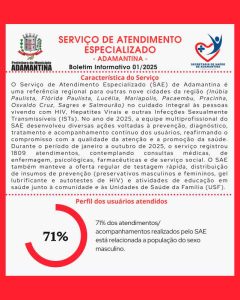 De janeiro a outubro de 2025, foram 1809 atendimentos com consultas, médicas, de enfermagem, psicológicas, farmacêuticas e de serviço social. o SAE, em parceria com as Equipes de Saúde da Família do município, ofertaram testes rápidos, promoveram a distribuição de insumos de prevenção e realizaram diversas atividades educativas em saúde, junto à comunidade e escolas.