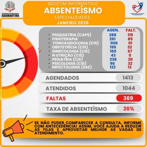 A Secretaria Municipal de Saúde de Adamantina divulgou os boletins informativos de absenteísmo referentes aos meses de janeiro e fevereiro de 2026, apontando um índice elevado de faltas em consultas especializadas na rede pública.