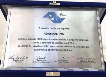 Os atendimentos realizados pelo órgão são voltados às micro e pequenas empresas. Na placa, o Sebrae- SP agradece a parceria e a concretização de ações de fomento ao desenvolvimento local.
