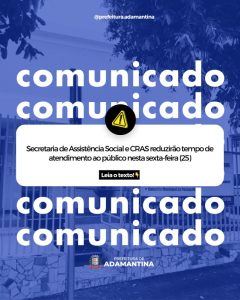 A Prefeitura de Adamantina, por meio da Secretaria de Assistência Social, informa que devido à realização da festa julina, o Centro de Referência da Assistência Social (CRAS) e o órgão gestor encerrarão o atendimento ao público às 15h. Na segunda-feira (28), o atendimento será retomado a partir das 7h.