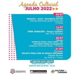 Após realizar uma programação que durou os meses de maio e junho com o objetivo de comemorar os 73 anos de Adamantina, a Secretaria de Cultura de Turismo anuncia a programação para o mês de julho. A iniciativa contempla atividades culturais e artísticas.