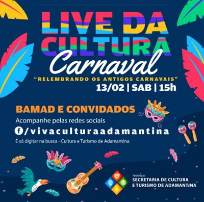 A Secretaria de Cultura e Turismo de Adamantina promove neste sábado (13), a partir das 15h, a live “Relembrando os antigos carnavais”. A live será transmitida pelo facebook da secretaria (facebook/vivaculturaadamantina) e realizada no anfiteatro da Biblioteca Pública Municipal.
