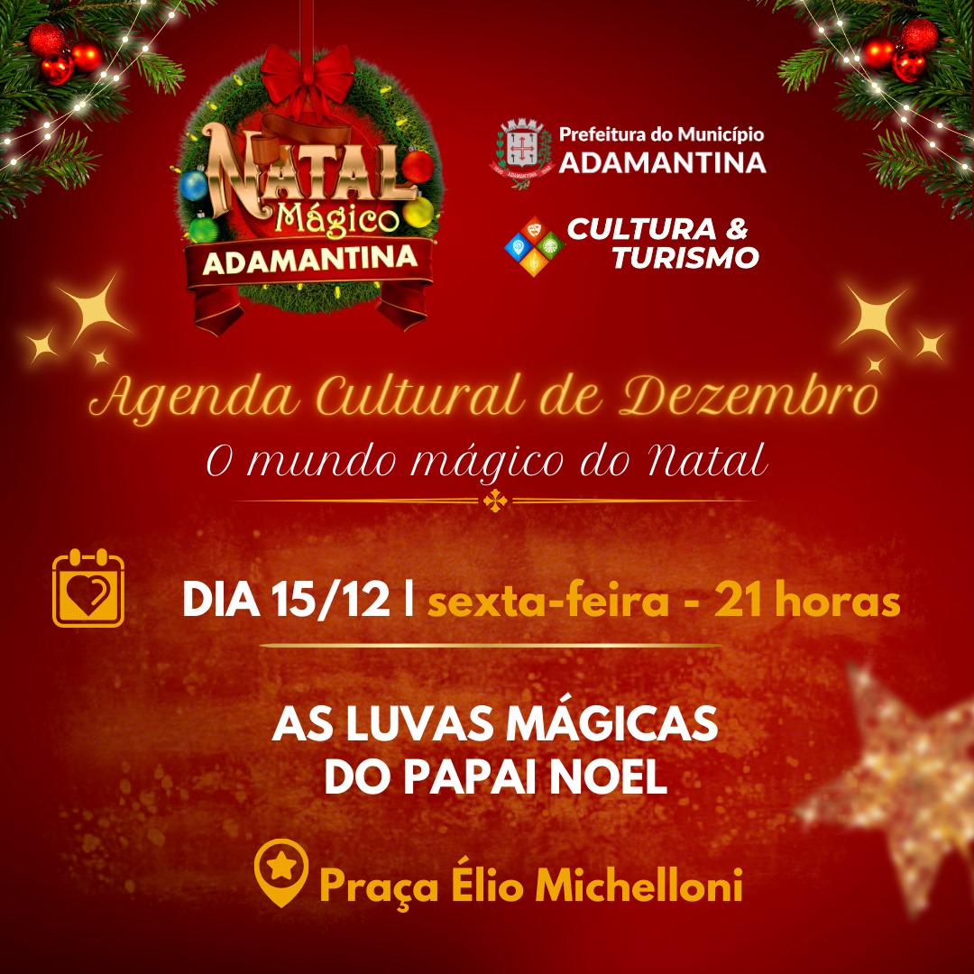 Nesta sexta-feira (15), às 21 horas, a Praça Élio Michelloni receberá o evento “As Luvas Mágicas do Papai Noel”, um espetáculo circense e natalino para toda a família.