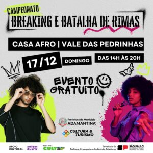 No próximo domingo (17 de dezembro), a Casa Afro de Adamantina será palco de um espetáculo de talento e cultura. O Campeonato Municipal de Breaking e Batalha de Rimas, realizado com o fomento da Secretaria de Cultura e Economia Criativa do Estado de São Paulo e da Secretaria de Cultura e Turismo de Adamantina, encerra as atividades da Casa Afro neste ano de 2023.
