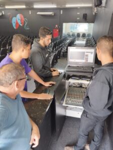 Quanto ao treinamento, os estagiários estão recebendo um curso de aprendizagem de sonoplastia.