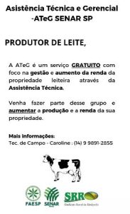 “O programa de Assistência Técnica e Gerencial do Senar (ATeG) é um programa para os produtores de leite e corte das cidades de Osvaldo Cruz e Rinópolis que visa levar a assistência técnica de forma gratuita à essas propriedades. Com foco na gestão, o programa tem como foco a sustentabilidade e viabilidade da produção, melhorando a produção e os lucros dos produtores.