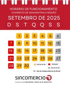 SINCOMERCIO divulga horário de funcionamento do comércio de Adamantina e Região em Setembro de 2025