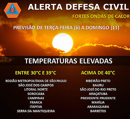 05/10/2020 18h34 Sensação térmica pode ultrapassar os 45°C em algumas regiões paulistas A Coordenadoria Estadual de Proteção e Defesa Civil alerta que, entre terça-feira (6)