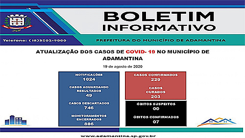19/08/2020 16h57 Mais de 200 munícipes estão curados A Prefeitura de Adamantina, por meio da Secretaria de Saúde, informa que hoje (19), nenhum novo