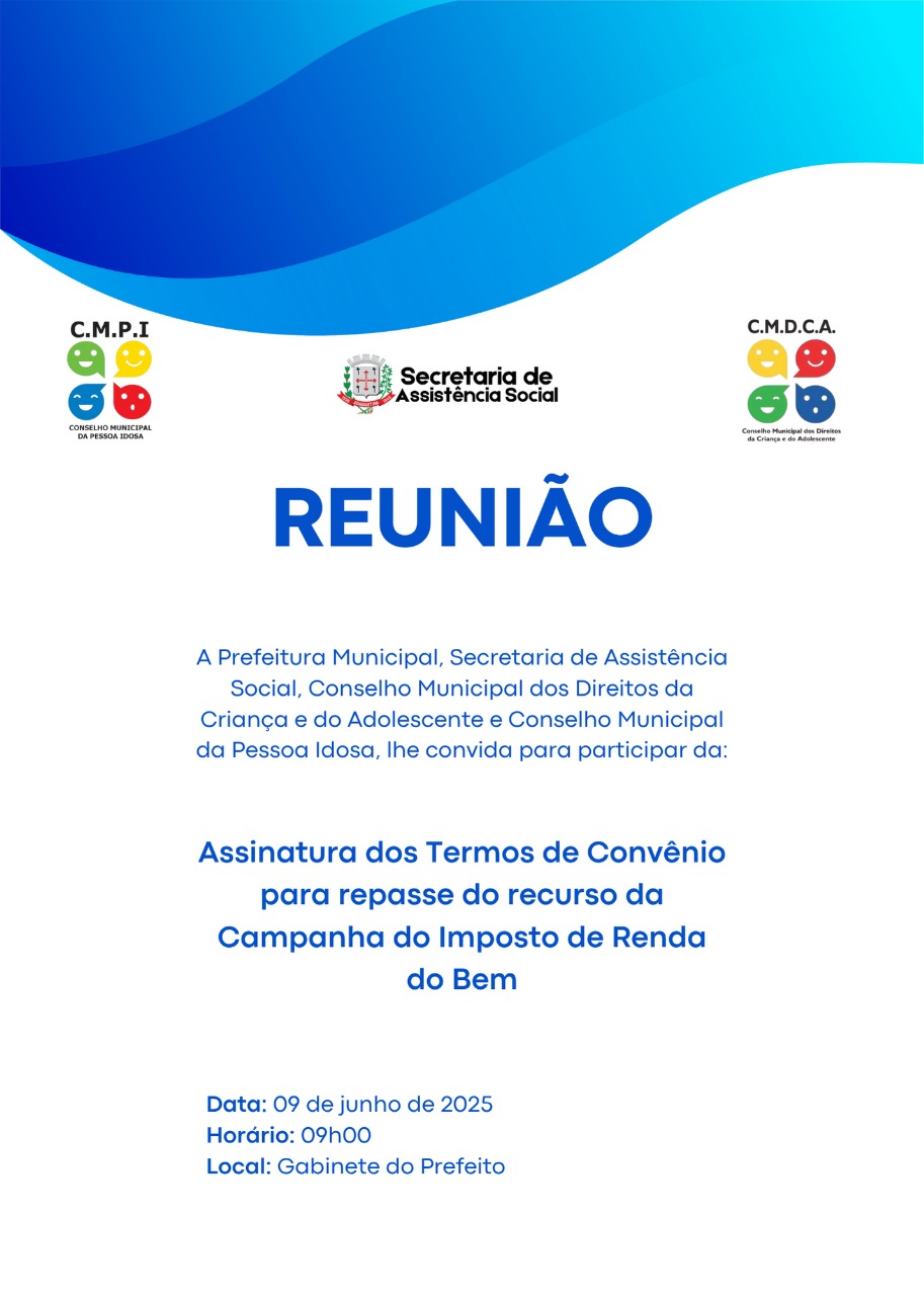 Em reunião realizada na manhã de hoje (09/06) no Gabinete do Prefeito José Carlos Tiveron, representantes das entidades beneficiadas assinaram os termos de Convênio para repasse do recurso oriundo da Campanha do Imposto de Renda do Bem.