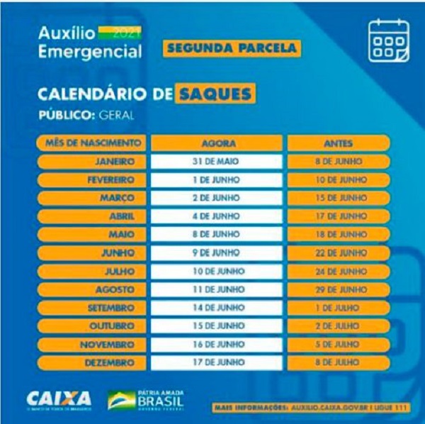 Os trabalhadores informais e inscritos no Cadastro Único para Programas Sociais do Governo Federal (CadÚnico) nascidos em maio podem sacar, a partir desta terça-feira (8), a segunda parcela do auxílio emergencial 2021. O dinheiro havia sido depositado nas contas poupança digitais da Caixa Econômica Federal em 21 de maio. A terceira parcela poderá ser sacada, a partir de 22 de julho, e a quarta a partir de 28 de agosto.