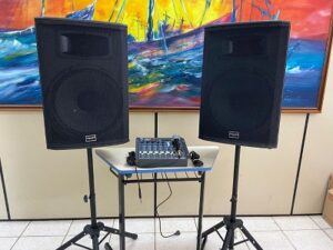 Conjuntos são compostos por uma caixa ativa, uma caixa passiva, uma mesa de som, dois tripé para as caixa de som e um microfone