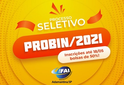 Seguem abertas até 18 de maio as inscrições para o Processo Seletivo para a concessão 38 bolsas de estudos de 50% pelo Programa de Bolsas Institucionais (Probin) do Centro Universitário de Adamantina (UniFAI), destinadas aos alunos vestibulandos.