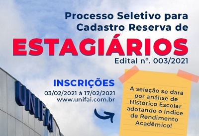 As inscrições serão recebidas até o dia 17 de fevereiro, Quarta-feira de Cinzas, exclusivamente pelo hotsite www.unifai.com.br/concursos. É importante lembrar que, segundo o Edital nº 003/2021, “aos beneficiários de estágios concedidos por órgão público federal, estadual ou municipal, não será permitido o acúmulo de estágio (ter o benefício de dois ou mais estágios)”.