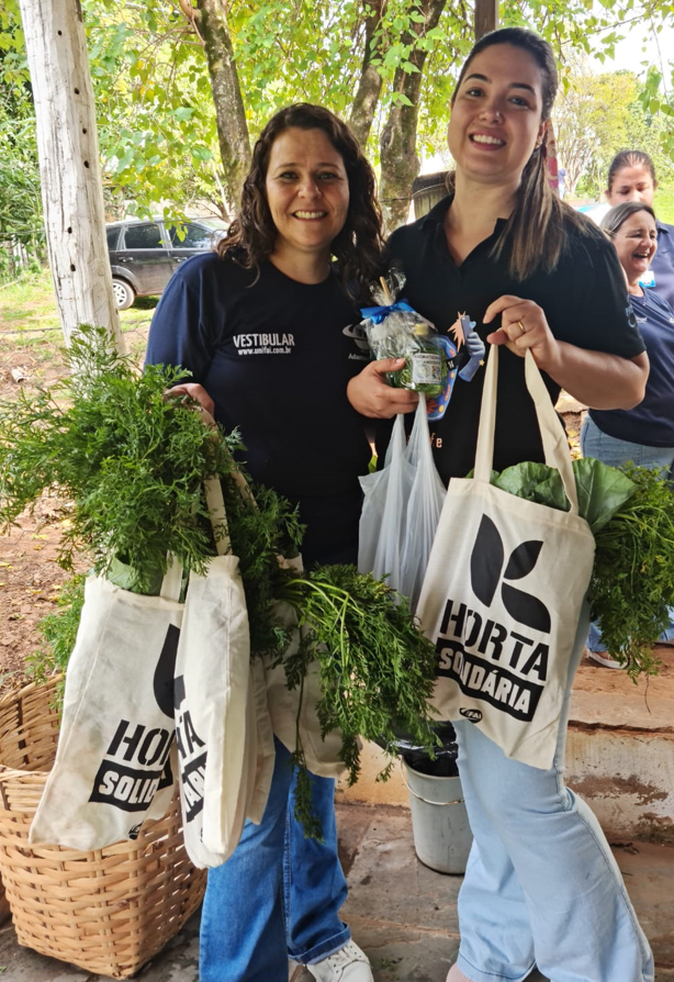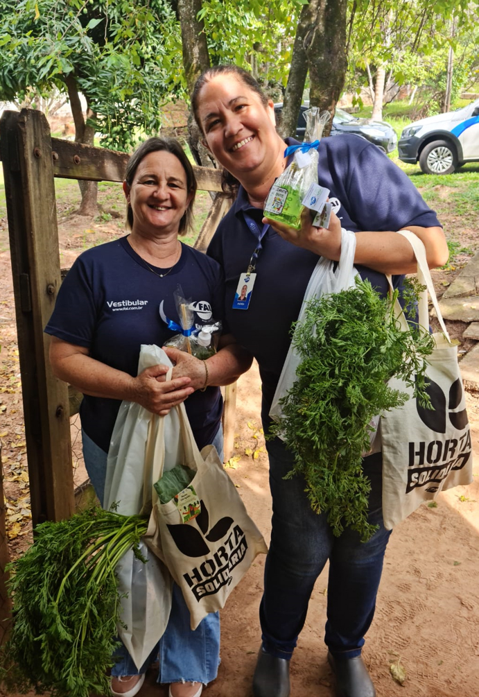 Os kits, acondicionados em uma ecobag personalizada, continham cebolinha, alface comum e roxa, cenoura, couve e rúcula cultivadas na Horta Experimental do curso de Agronomia, além de sal de ervas (produzido pelo curso de Nutrição), sabonete líquido e aromatizante (produzidos pelo curso de Farmácia).