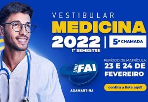 Os candidatos aprovados no Vestibular de Medicina 2022 do Centro Universitário de Adamantina (UniFAI) e convocados na quinta chamada deverão efetuar matrícula nestas quarta e quinta-feira, dias 23 e 24 de fevereiro, das 8h às 12h e das 13h às 17 horas, na Central de Matrículas e Rematrículas, no Câmpus I (rua Nove de Julho, 730).
