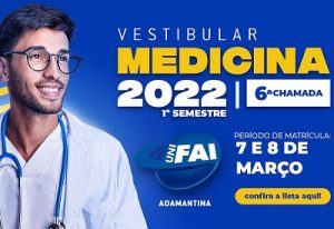 Os candidatos aprovados no Vestibular de Medicina 2022 do Centro Universitário de Adamantina (UniFAI) e convocados na sexta chamada deverão efetuar matrícula nas próximas segunda e terça-feira, dias 7 e 8 de março, das 8h às 12h e das 13h às 17 horas, na Secretaria do Câmpus I (rua Nove de Julho, 730).