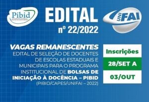O Centro Universitário de Adamantina (UniFAI) abre novo edital, com inscrições até a próxima segunda-feira, 3 de outubro, de seleção de docentes da rede básica para vagas remanescentes do Programa Institucional de Bolsas de Iniciação à Docência (PIBID), vinculado à Coordenação de Aperfeiçoamento de Pessoal de Nível Superior (CAPES). A entrega da documentação ocorre por meio de preenchimento de formulário eletrônico disponível em unifai.com.br.