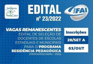 O Centro Universitário de Adamantina (UniFAI) abre inscrições de vagas remanescentes para professores de escolas estaduais e municipais atuarem como preceptores no Programa Residência Pedagógica (PRP). O período se encerra nesta segunda-feira, 3 de outubro, por meio do preenchimento de formulário eletrônico.