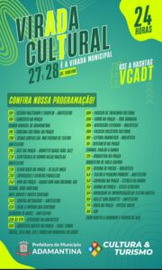24 horas de cultura. Assim será o final de semana em Adamantina com a realização da “Virada Cultural Municipal”. A programação tem início às 18h de sábado (27) e chega ao fim às 18h de domingo(28) e é uma iniciativa da Prefeitura de Adamantina, por meio da Secretaria de Cultura e Turismo.